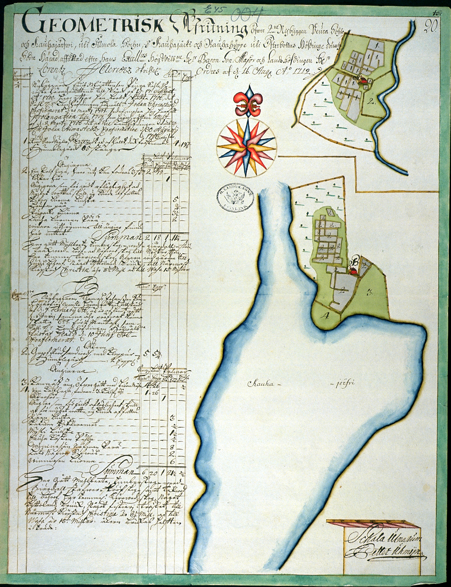 Geometrinen kuvaus kahdesta uudistilasta, Peura Salosta ja Kauhajärvestä, Ilmajoen pitäjässä, Kauhajoella ja Kauhahyypällä Pohjanmaan eteläisessä kihlakunnassa. Piirretty hänen korkeutensa hyväsyntyisen paroni ja kenraalimajuri Herra Lorentz Clerckin kirjallisen määräyksen mukaan 16.elokuuta vuonna 1712.