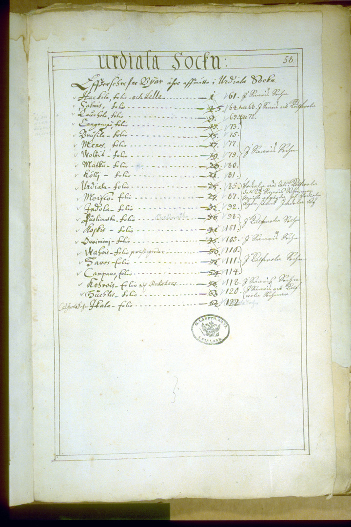 (huom. vanhat folionumerot yliviivattu, mukana tässä uudet numerot. Kylien nimet alkuperäisessä muodossa)