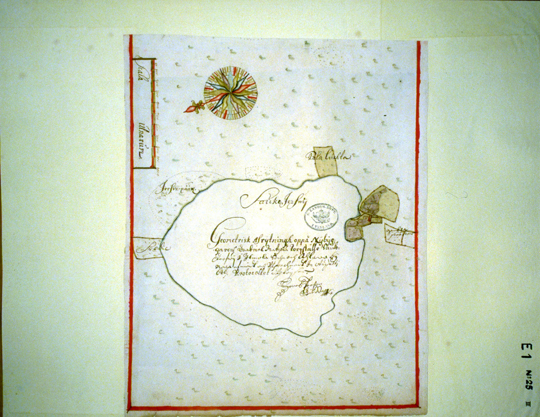 GEOMETRINEN KUVAUS uudisasukas Gabriel Matzonin torpanpaikasta Saukkojärvestä, Ilmajoen pitäjässä ja Alavuden kylässä. Tarkoin mitannut ja laskenut elokuussa 1689. Pöytäkirja osoittaa.