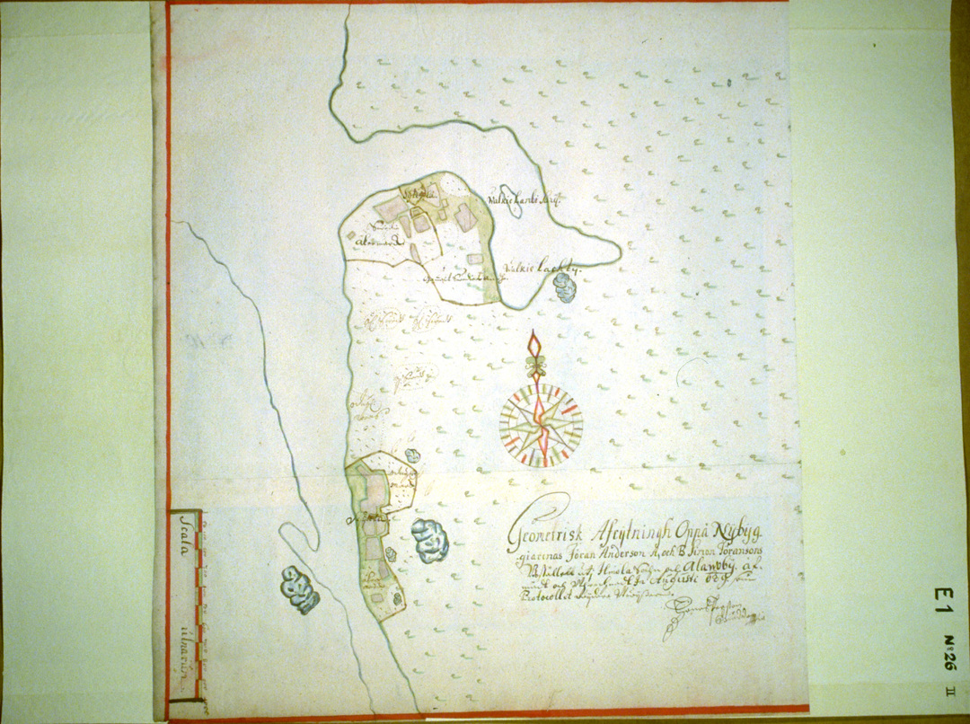 GEOMETRINEN KUVAUS uudisasukkaiden Jöran Andersonin A. ja B Simon Jöransonin torpanpaikoista Ilmajoen pitäjässä ja Alavuden kylässä. Mitattu ja laskettu elokuussa 1689, kuten pöytäkirja osoittaa.