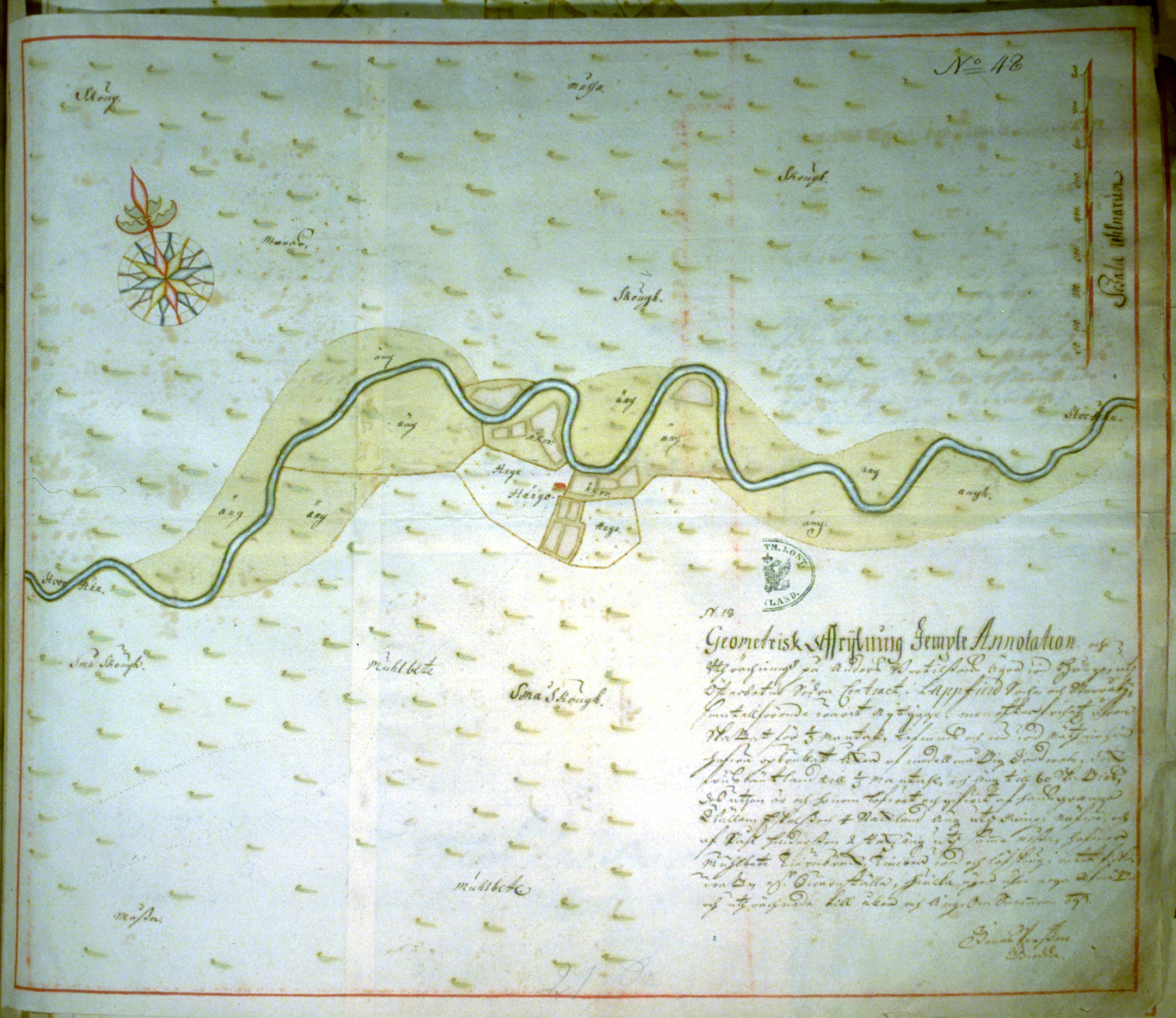 GEOMETRINEN KUVAUS SEKÄ MUISTIINPANO ja laskelma Anders Bertilssonin omistuksista lähellä Honkoa/Hångo, Pohjanmaan eteläisessä voutikunnassa, Lapväärtin pitäjässä ja Isojoella, ja joka aikaisemmin on ollut uudistila mutta vapaavuosien jälkeen verotettu 1/3 manttaalista. Havaittiin nyt mittauksen yhteydessä, että hän oli raivannut laadultaan keskinkertaista, tosin kylmänarkaa poltettua/kydötettyä maata 1/3 manttaalin edestä, ja niittyä 60 verokuormaa. Sen lisäksi on hänen naapurinsa Wällam Eskelsson antanut hänelle 4 taakan/Stackland niityn Rimpinevalta, ja Påhjl Hendersson 2 taakan/stakzäng samalta nevalta. (Talolla) on laidunmaata, tervanpolttoa, polttopuuta ja lehdesmetsää, ei kalavesiä tai myllynpaikkaa. Nämä omistukset on tarkoin mitattu ja laskettu peltoineen ja niittyineen kesällä (1)693.